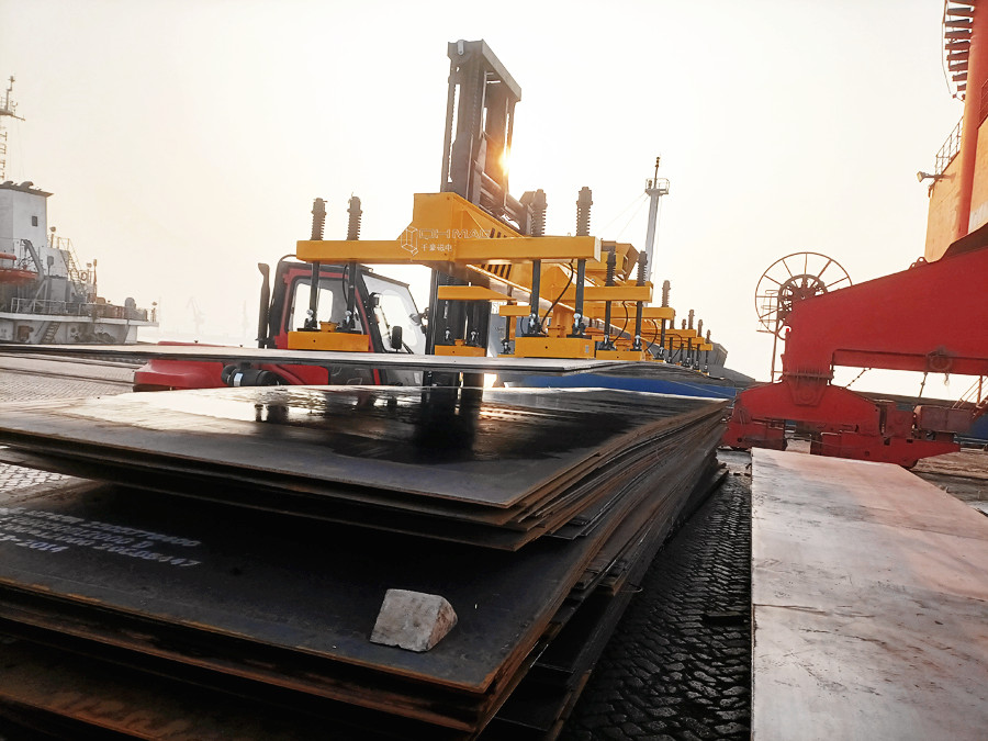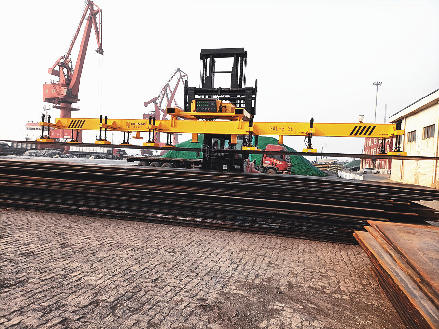 此款磁力吊具用在港口配合叉車使用吊運長鋼板。本套充電式鋼板起重吊具采用12組電永磁起重器聯(lián)吊??蓪崿F(xiàn)單張鋼板max重量為4噸、厚度8mm、10mm、12mm鋼板一次搬運二張平穩(wěn)運行。厚度14mm、16mm鋼板一次搬運一張平穩(wěn)運行。